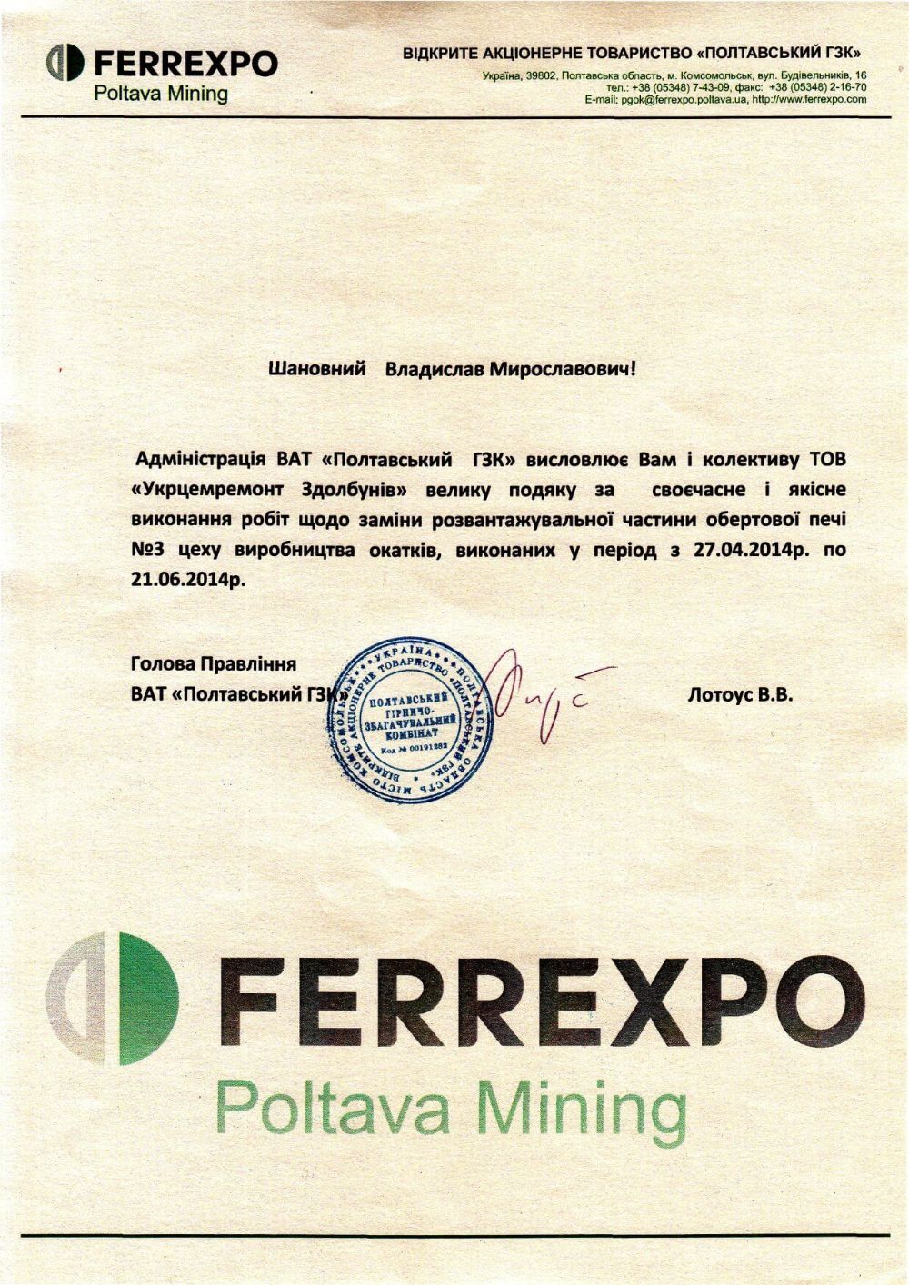 - Заміна 1/3 частини обертової печі №3 цеха виробництва окатків (2014)